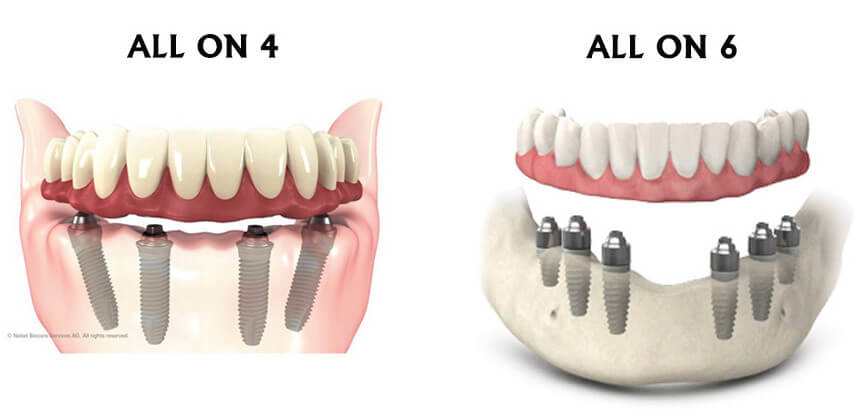 Dr. Vaidyan can provide an excellent alternative with All on 4/6 implant bridges in the Vadodara. All on 4/6 provides patients with a fixed full arch dental implant retained bridge, or in other words, a full set of teeth attached by as few as 4 or as many as 6 dental implants. This method works using the strategic placement of 4 to 6 dental implants in the densest areas of the jawbone at specific angles. Those implants are anchors for a full arch bridge. Compared to traditional implant placement to replace individual missing teeth (1 implant for each tooth), the all on 4/6 technique uses implants at specific locations and angles, drawing strength across the entire arch, allowing for the attachment of a full arch prosthesis (4 to 6 implants for an entire arch of teeth).